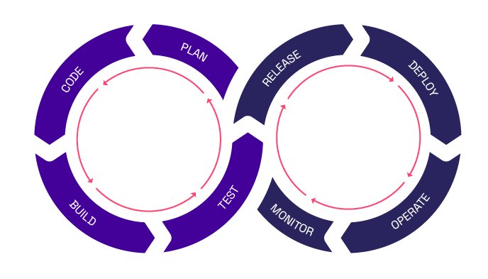 Aktiviteter inom DevOps pågår samtidigt i en oändlig loop.